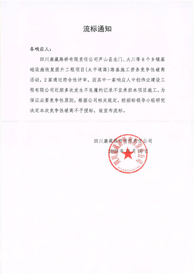 四川康藏路桥有限责任公司芦山县龙门、大川等8个乡镇基础设施恢复提升工程项目(太平道路)路基施工劳务流标通知