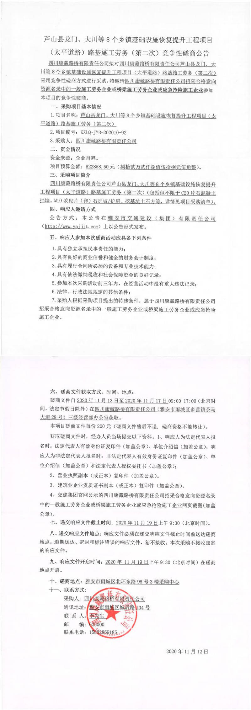 四川康藏路桥有限责任公司芦山县龙门、大川等8个乡镇基础设施恢复提升工程项目(太平道路)路基施工劳务(第二次)竞争性磋商公告