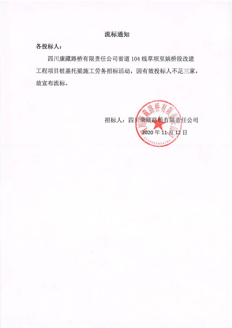 四川康藏路桥有限责任公司省道104线草坝至姚桥段改建工程项目桩基托梁施工劳务流标通知
