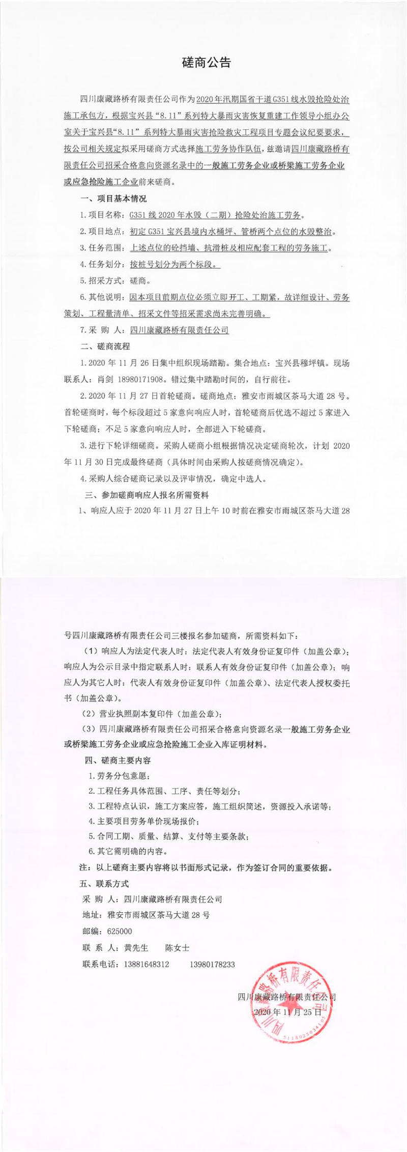 四川康藏路桥有限责任公司G351线2020年水毁(二期)抢险处治施工劳务磋商公告