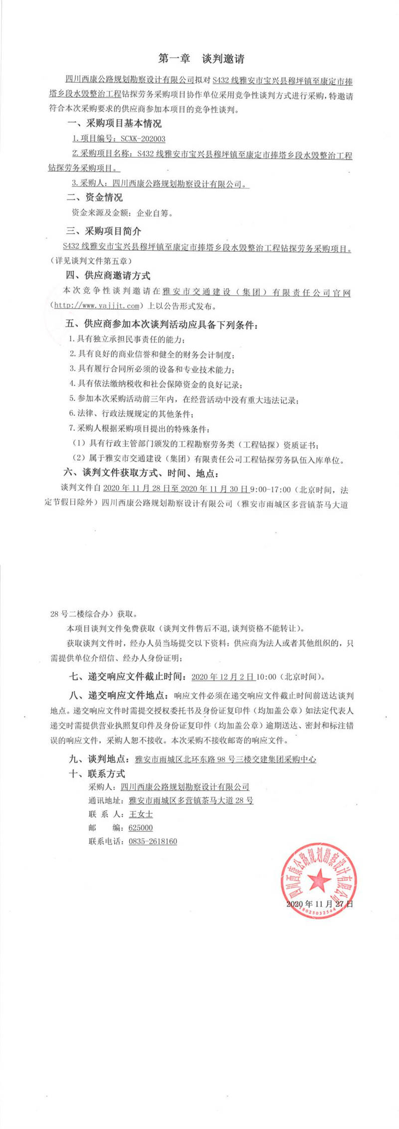 四川西康公路规划勘察设计有限公司S432线雅安市宝兴县穆坪镇至康定市捧塔乡段水毁整治工程钻探劳务采购项目谈判公告