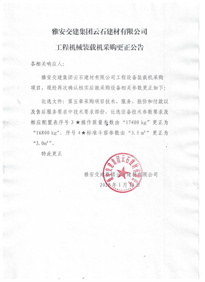 米兰体育-米兰(中国)官网 云石建材有限公司工程机械装载机采购更正公告