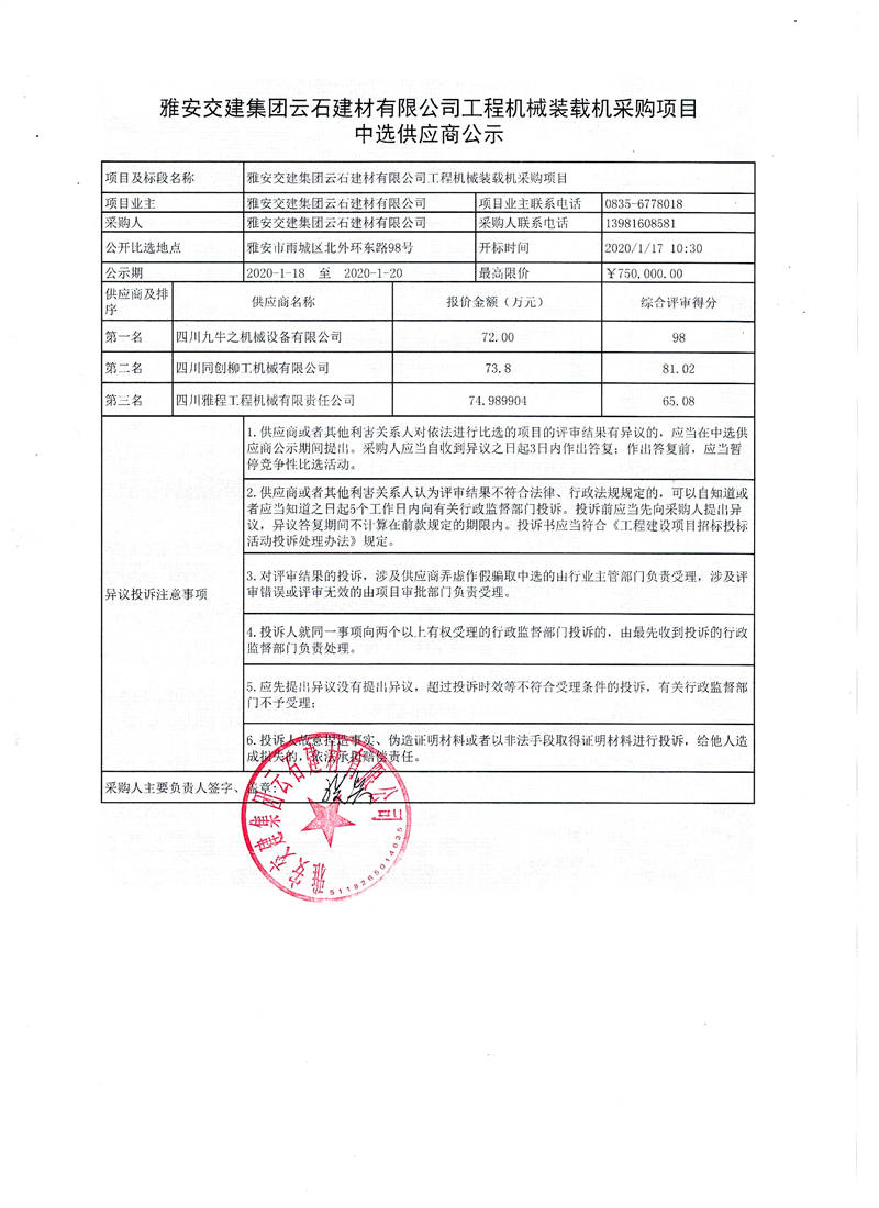 米兰体育-米兰(中国)官网 云石建材有限公司工程机械装载机采购项目中选供应商公示