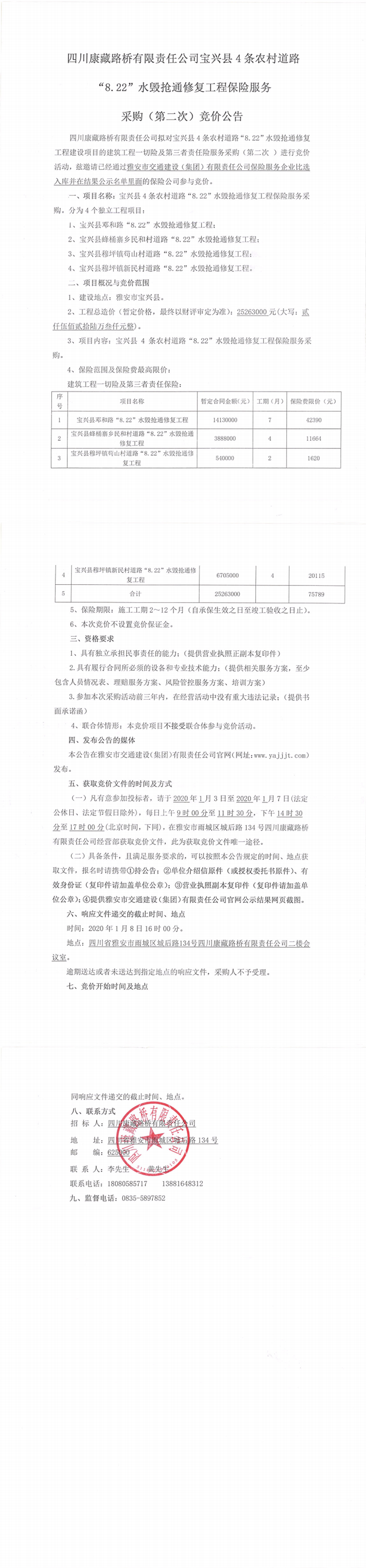 四川康藏路桥有限责任公司宝兴县4条农村道路“8.22”水毁抢通修复工程保险服务采购(第二次)竞价公告