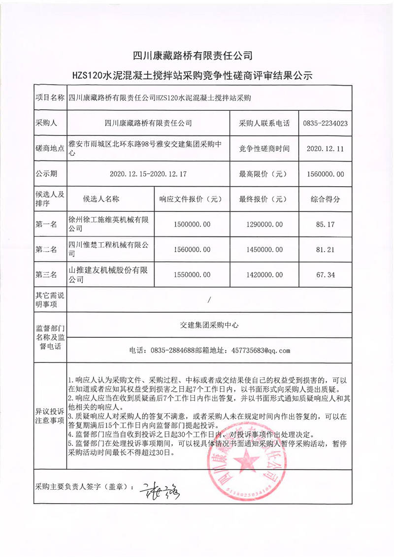 四川康藏路桥有限责任公司HZS120水泥混凝土搅拌站采购竞争性磋商结果公示