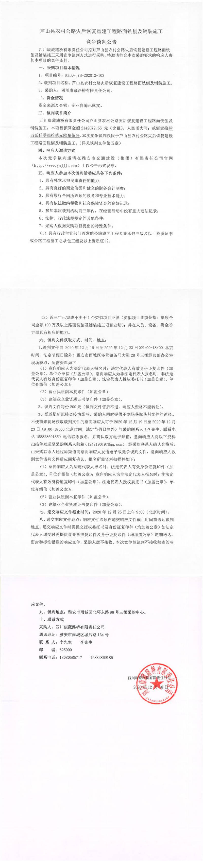 四川康藏路桥有限责任公司芦山县农村公路灾后恢复建设工程路面铣刨及铺装施工竞争谈判公告