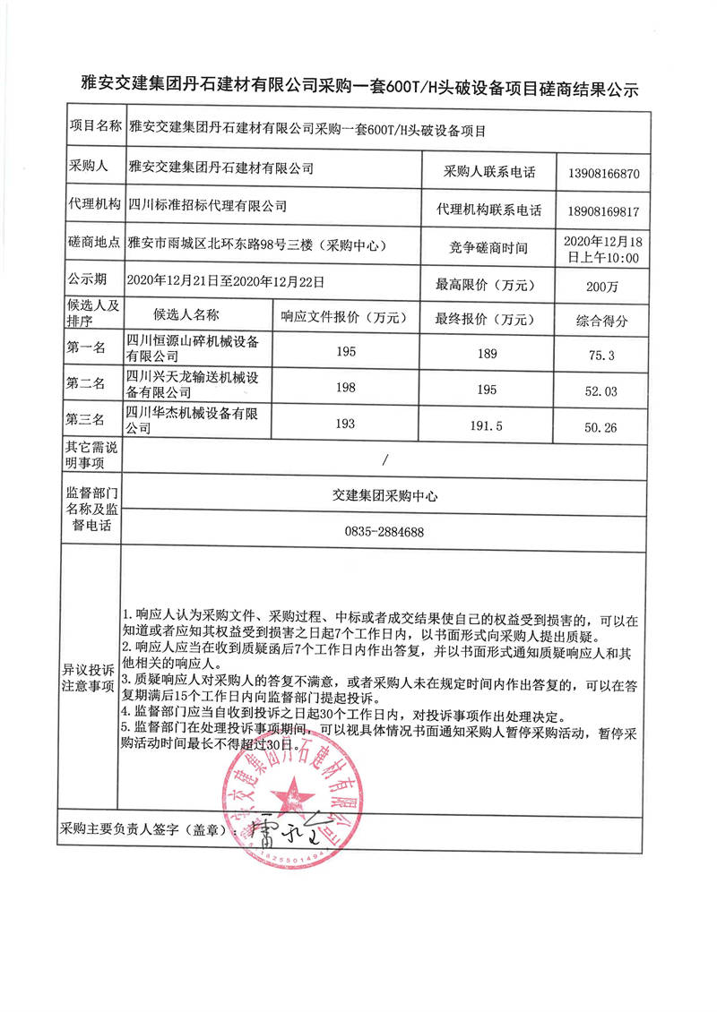 米兰体育-米兰(中国)官网 丹石建材有限公司采购一套600T/H头破设备项目磋商结果公示