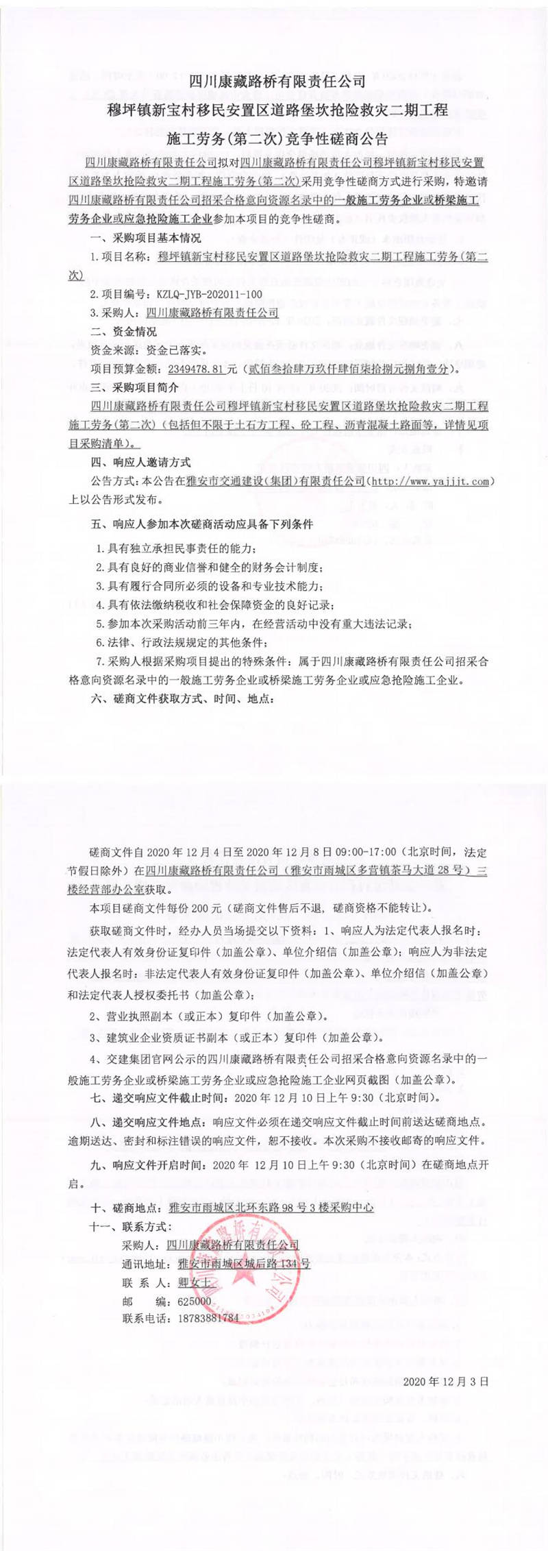 四川康藏路桥有限责任公司穆坪镇新宝村移民安置区道路堡坎抢险救灾二期工程施工劳务(第二次)竞争性磋商公告
