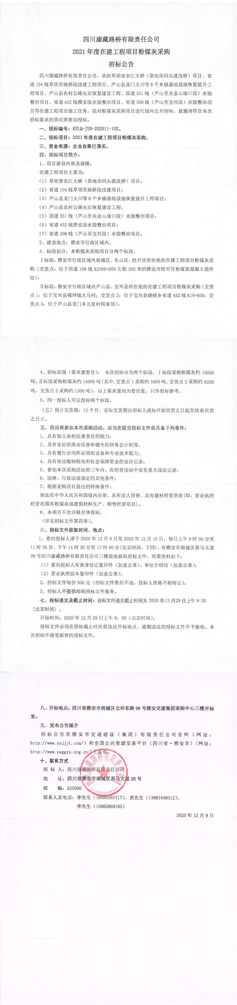 四川康藏路桥有限责任公司2021年度在建工程项目粉煤灰采购招标公告
