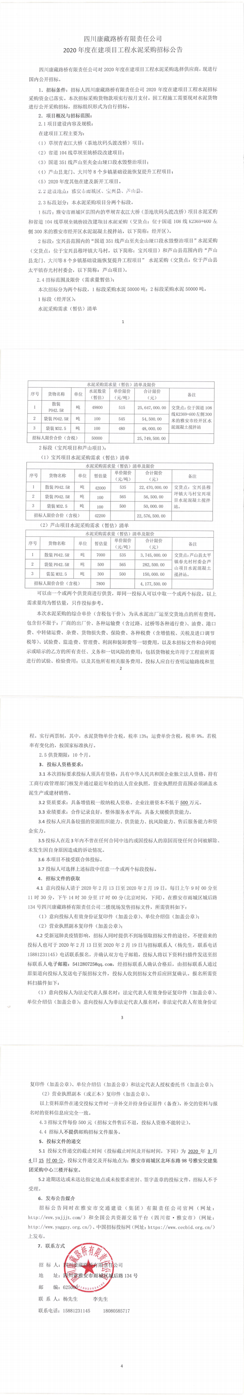 四川康藏路桥有限责任公司2020年度在建项目工程水泥采购招标公告