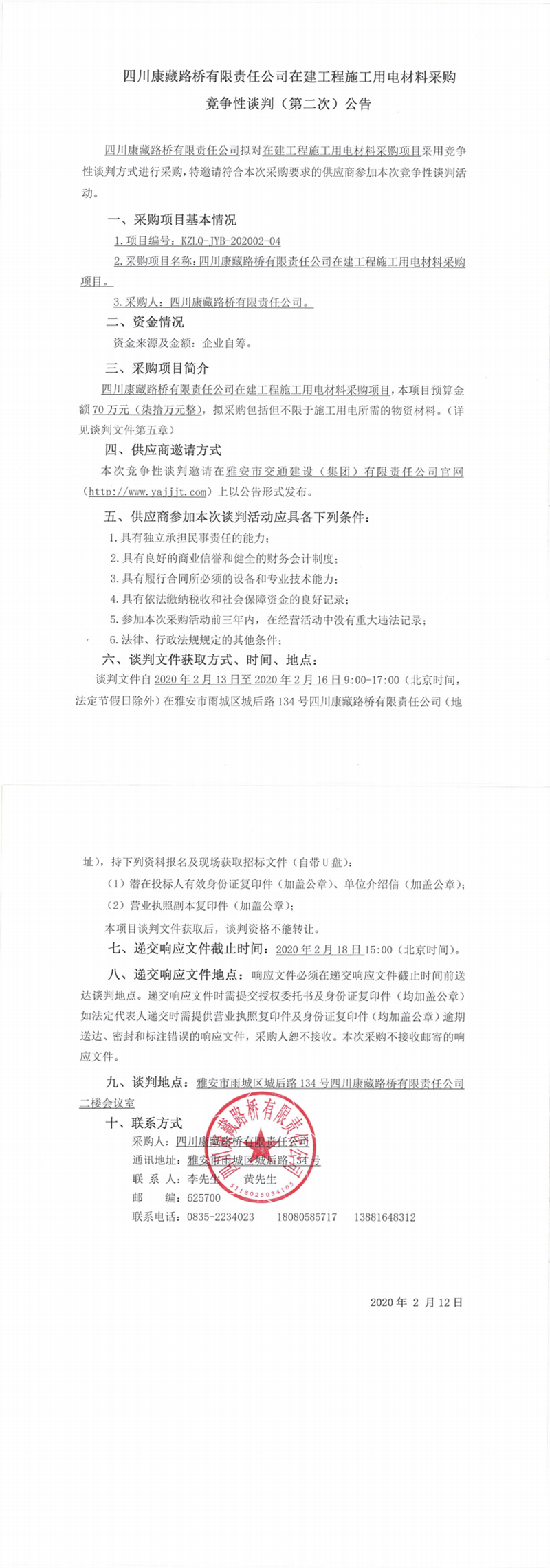 四川康藏路桥有限责任公司在建工程施工用电材料采购竞争性谈判(第二次)公告