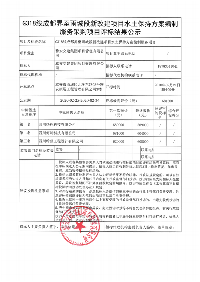 米兰体育-米兰(中国)官网 项目管理有限公司G318线成都界至雨城段新改建项目水土保持方案编制服务采购项目评标结果公示