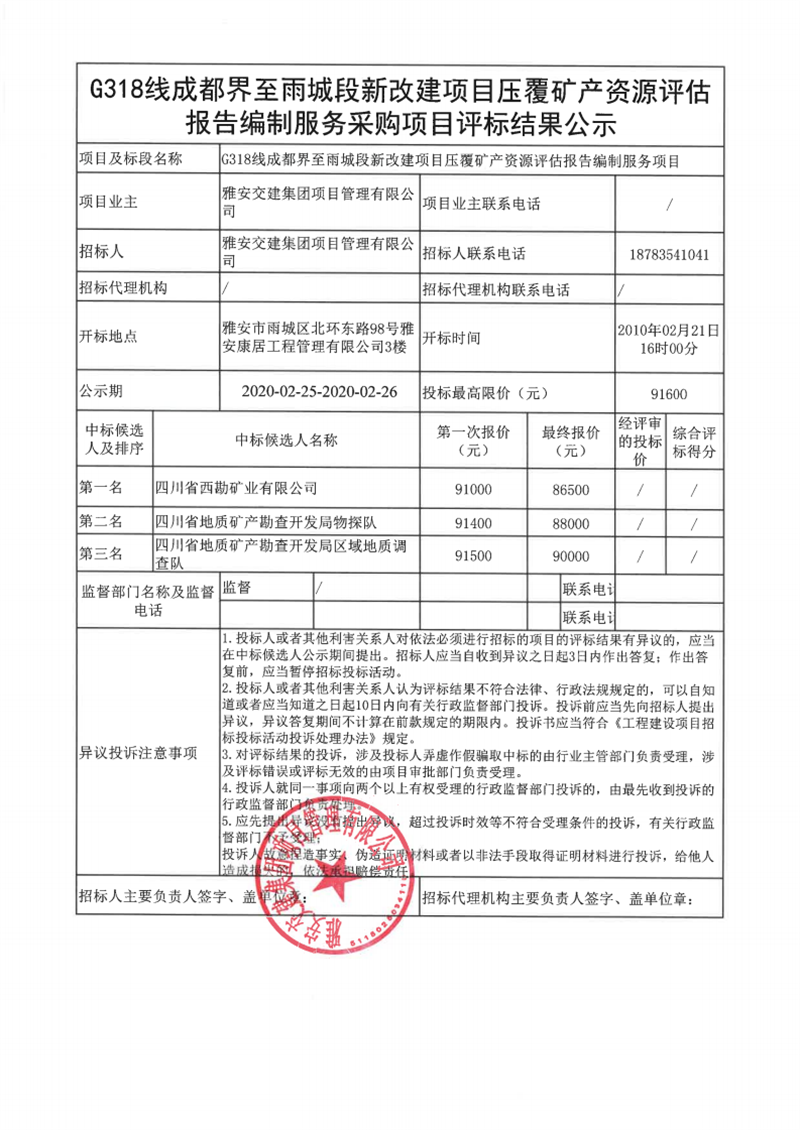 米兰体育-米兰(中国)官网 项目管理有限公司G318线成都界至雨城段新改建项目压覆矿产资源评估报告编制服务采购项目评标结果公示
