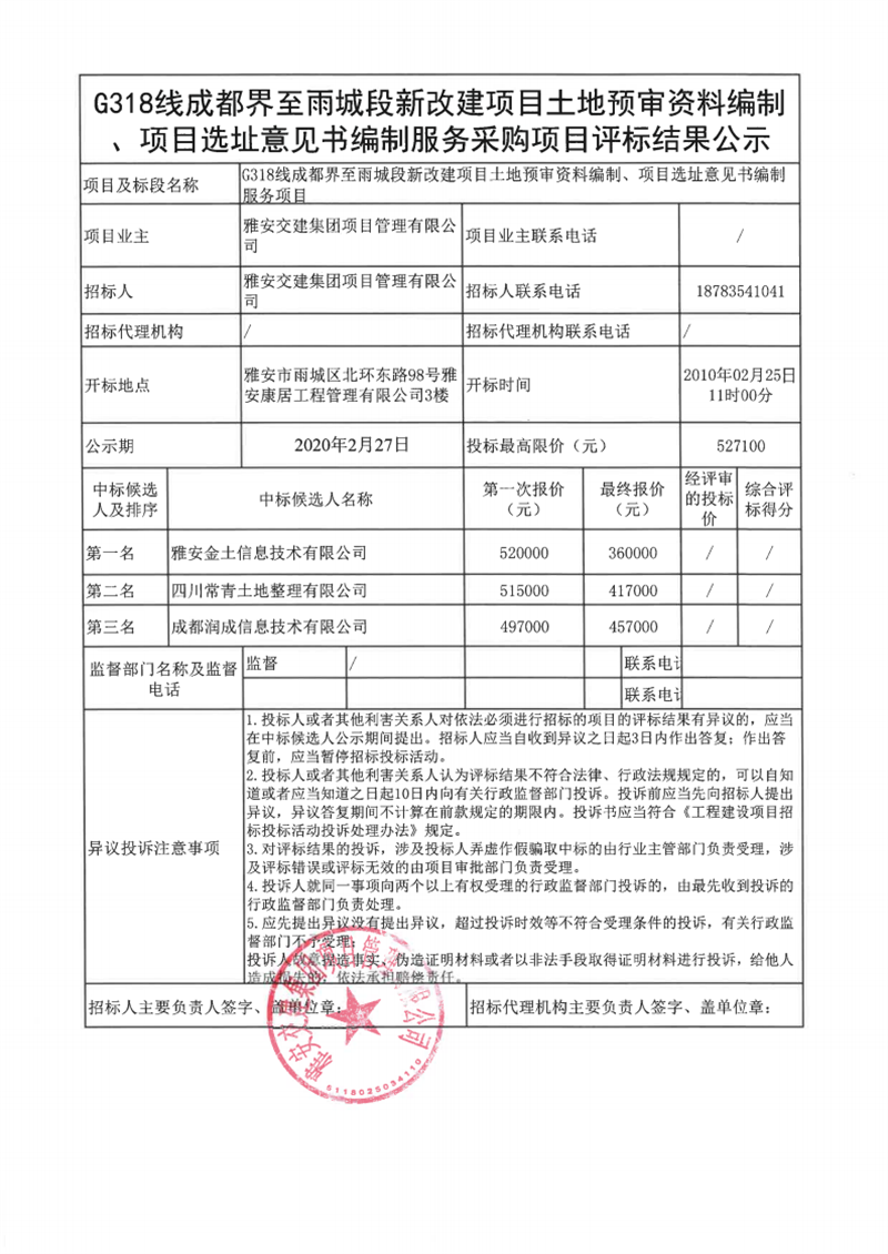 米兰体育-米兰(中国)官网 项目管理有限公司G318线成都界至雨城段新改建项目土地预审资料编制、项目选址意见书编制服务采购项目评标结果公示