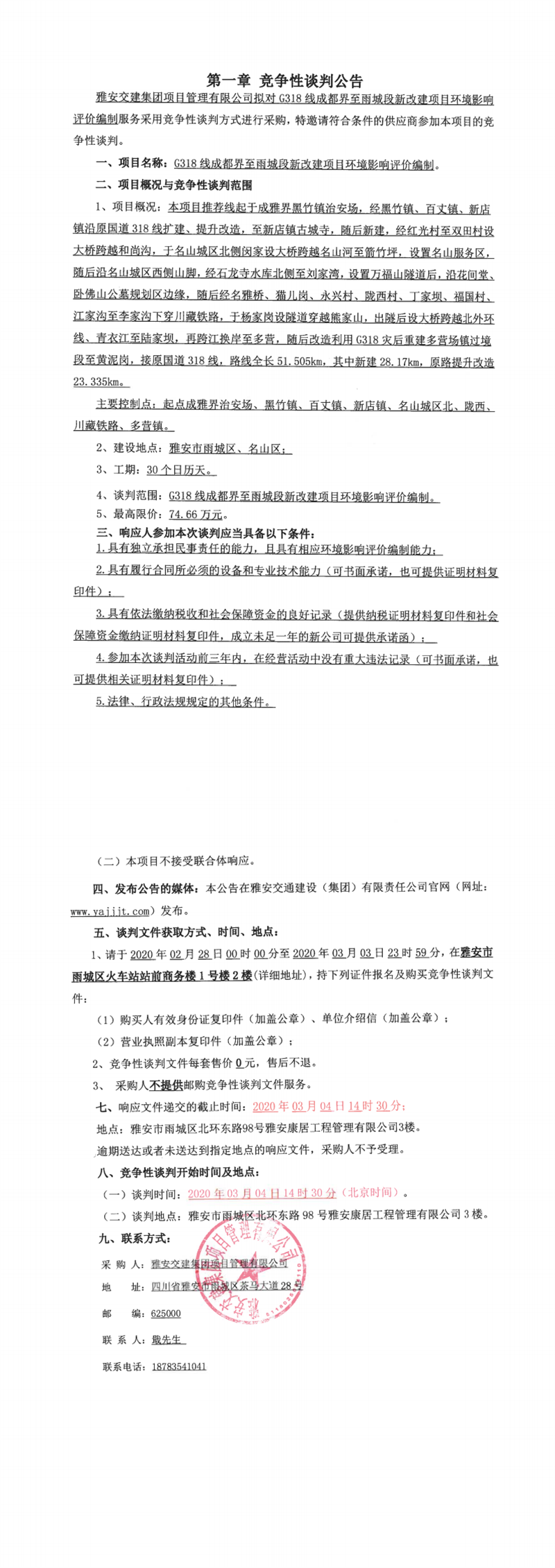 米兰体育-米兰(中国)官网 项目管理有限公司G318线成都界至雨城段新改建项目环境影响评价编制竞争性谈判公告