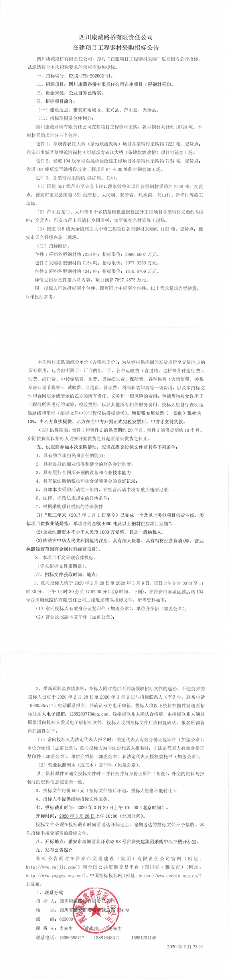 四川康藏路桥有限责任公司在建项目工程钢材采购招标公告