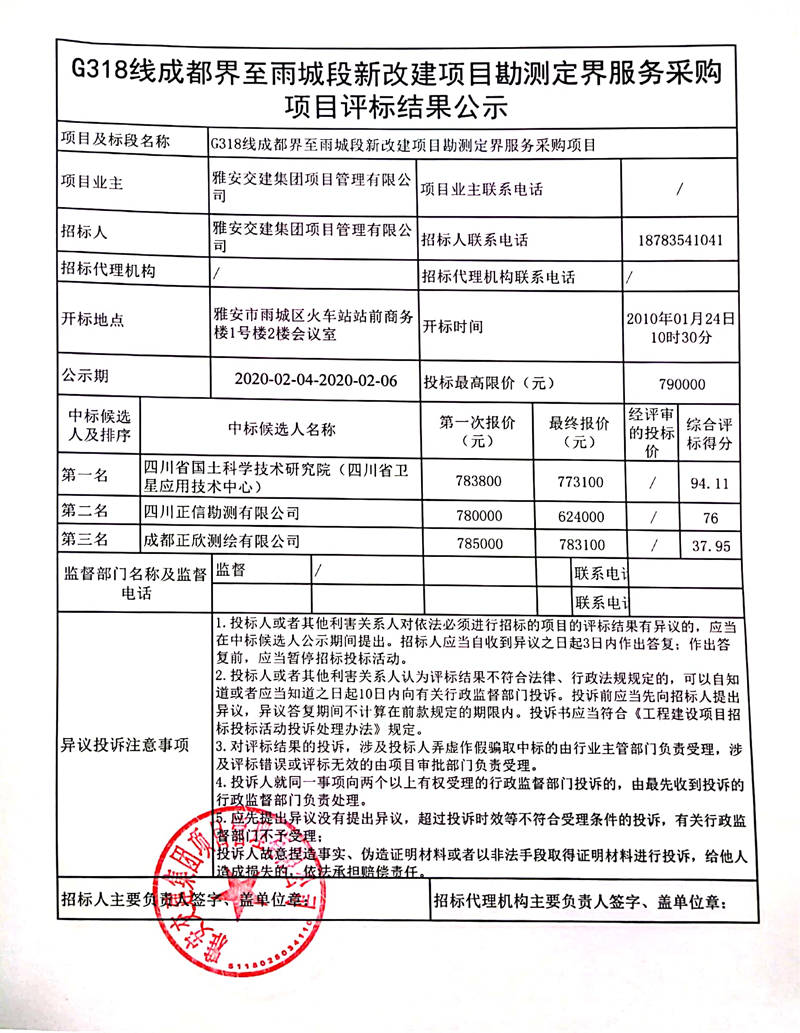 米兰体育-米兰(中国)官网 项目管理有限公司G318线成都界至雨城段新改建项目勘测定界服务采购项目评标结果公示
