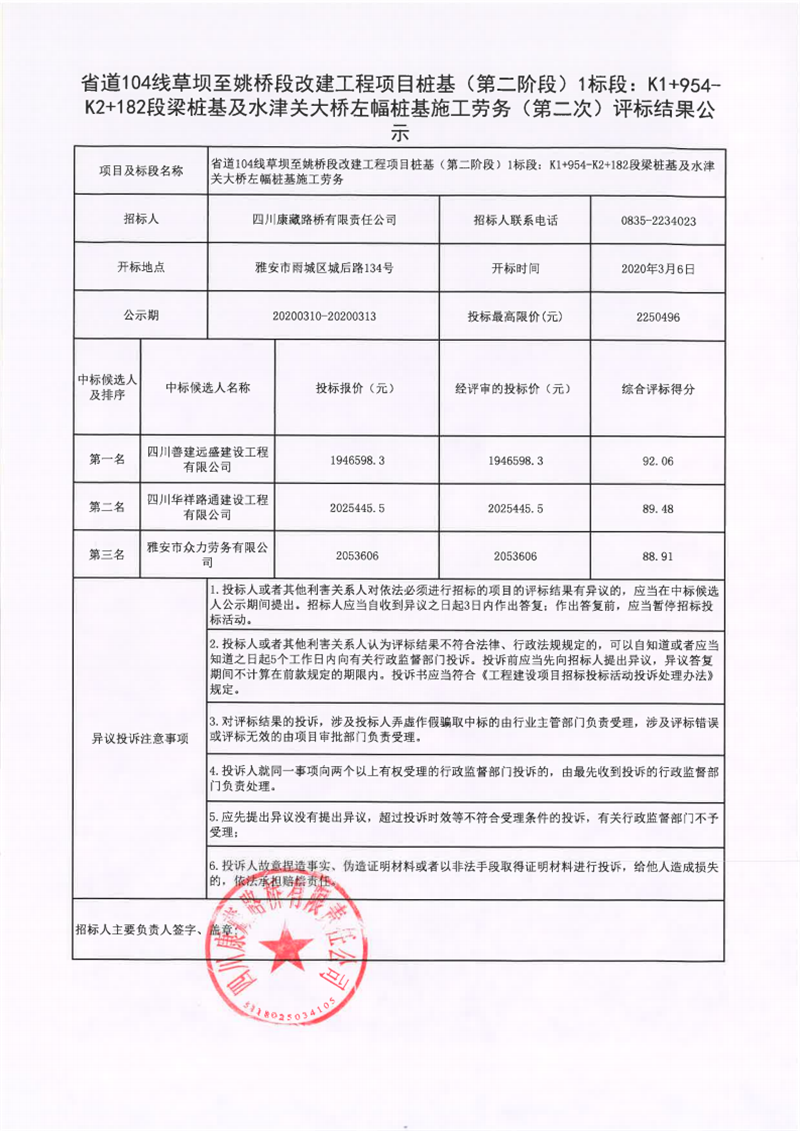 四川康藏路桥有限责任公司省道104线草坝至姚桥段改建工程项目桩基(第二阶段)1标段:K1+954-K2+182段梁桩基及水津关大桥左幅桩基施工劳务(第二次)评标结果公示