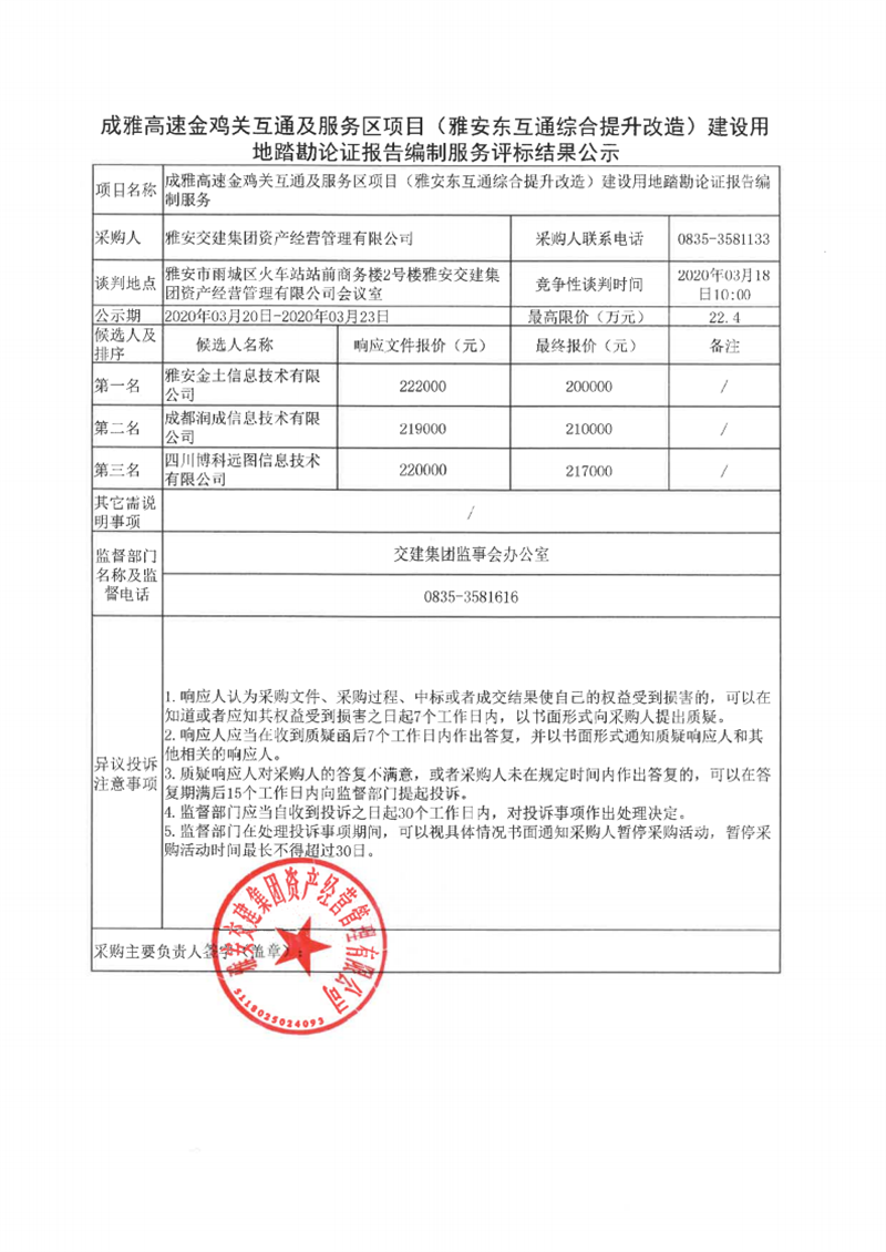 米兰体育-米兰(中国)官网 资产经营管理有限公司成雅高速金鸡关互通及服务区项目(雅安东互通综合提升改造)建设用地踏勘论证报告编制服务评标结果公示
