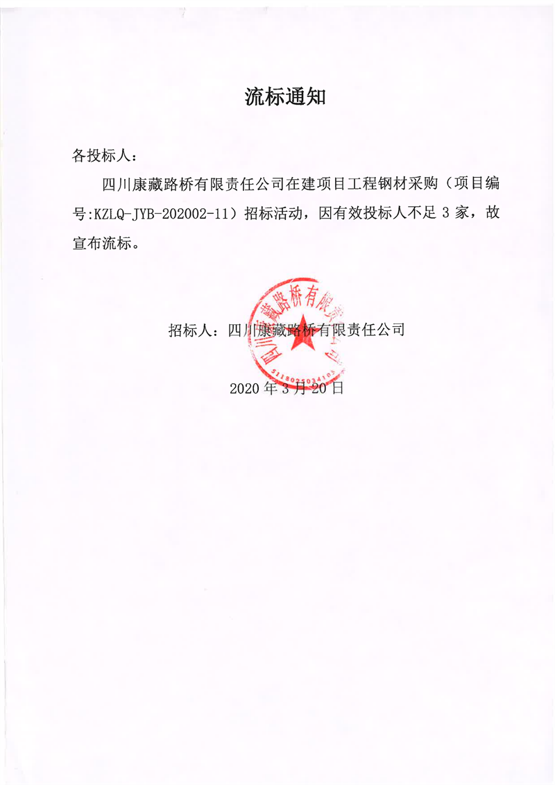 四川康藏路桥有限责任公司在建项目工程钢材采购流标通知