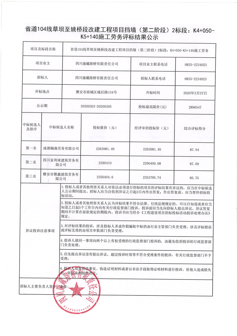 四川康藏路桥有限责任公司省道104线草坝至姚桥段改建工程项目挡墙(第二阶段)2标段:K4+050-K5+140施工劳务评标结果公示
