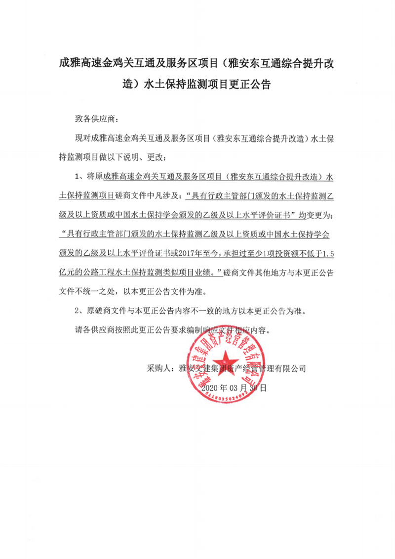 米兰体育-米兰(中国)官网 资产经营管理有限公司成雅高速金鸡关互通及服务区项目(雅安东互通综合提升改造)水土保持监测项目更正公告