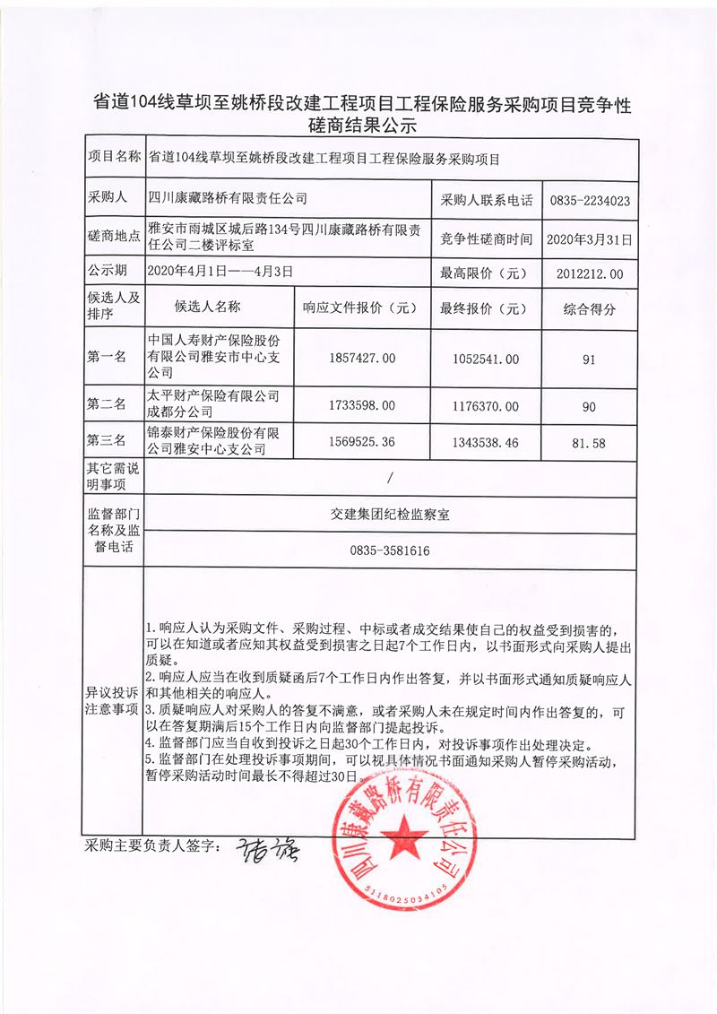 四川康藏路桥有限责任公司省道104线草坝至姚桥段改建工程项目工程保险服务采购项目竞争性磋商结果公示