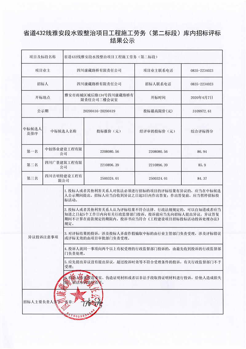 四川康藏路桥有限责任公司省道432线雅安段水毁整治项目工程施工劳务(第二标段)库内招标评标结果公示