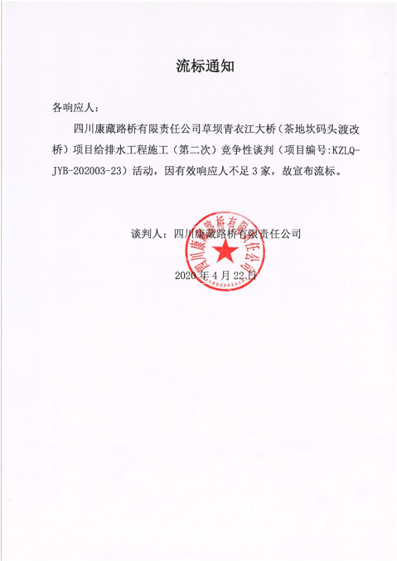 四川康藏路桥有限责任公司草坝青衣江大桥(茶地坎码头渡改桥)项目给排水工程施工(第二次)竞争性谈判流标通知