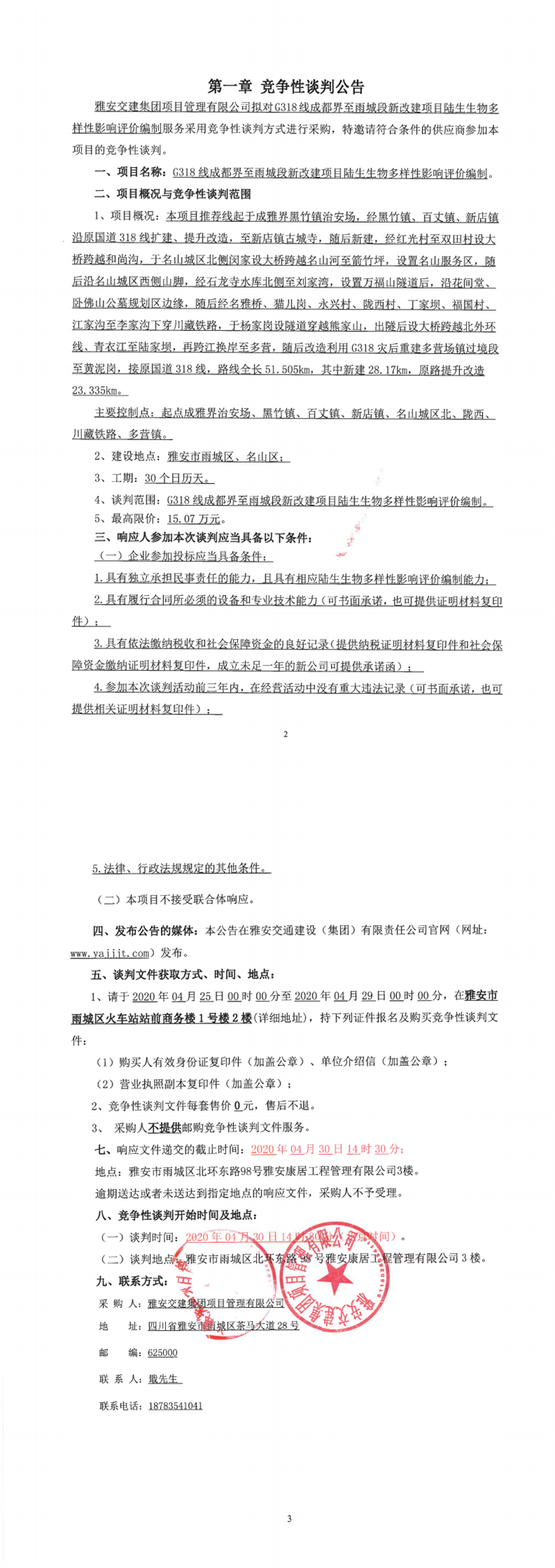 米兰体育-米兰(中国)官网 项目管理有限公司G318线成都界至雨城段新改建项目陆生生物多样性影响评价编制竞争性谈判公告