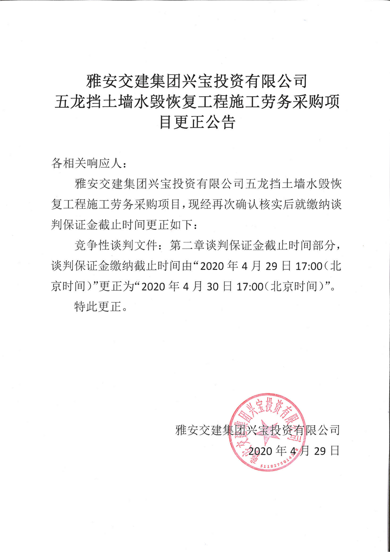 米兰体育-米兰(中国)官网 兴宝投资有限公司五龙挡土墙水毁恢复工程施工劳务采购项目更正公告