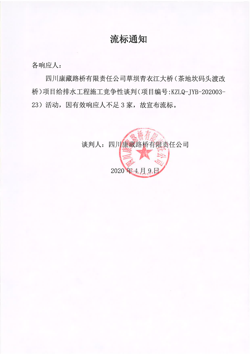 四川康藏路桥有限责任公司草坝青衣江大桥(茶地坎码头渡改桥)项目给排水工程施工竞争性谈判流标通知
