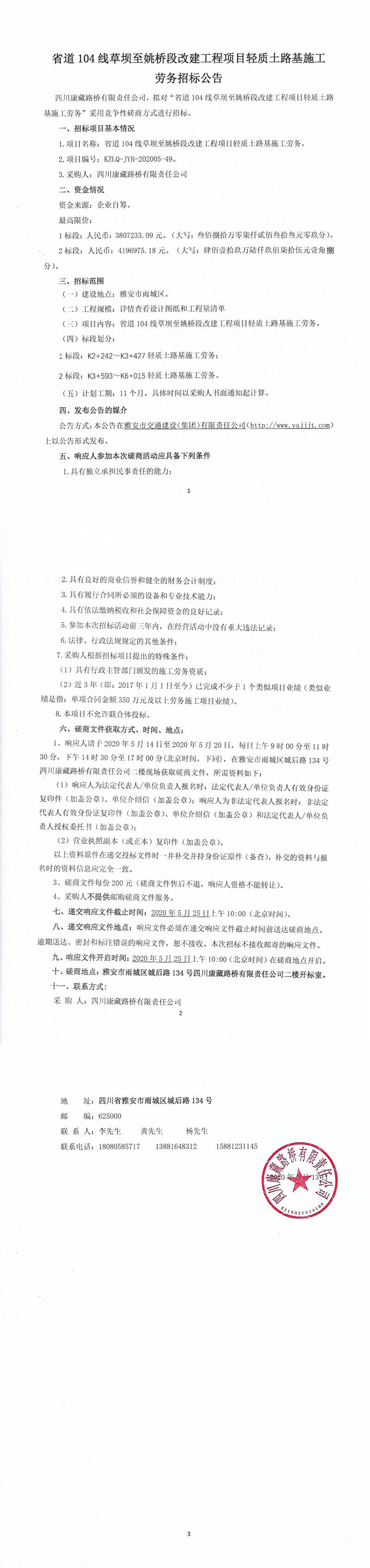 四川康藏路桥有限责任公司省道104线草坝至姚桥段改建项目轻质土路基施工劳务招标公告