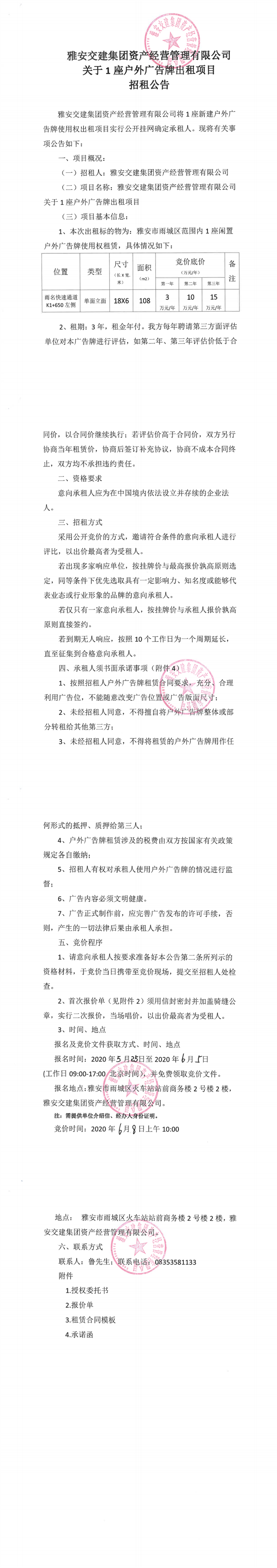 米兰体育-米兰(中国)官网 资产经营管理有限公司关于1座户外广告牌出租项目招租公告