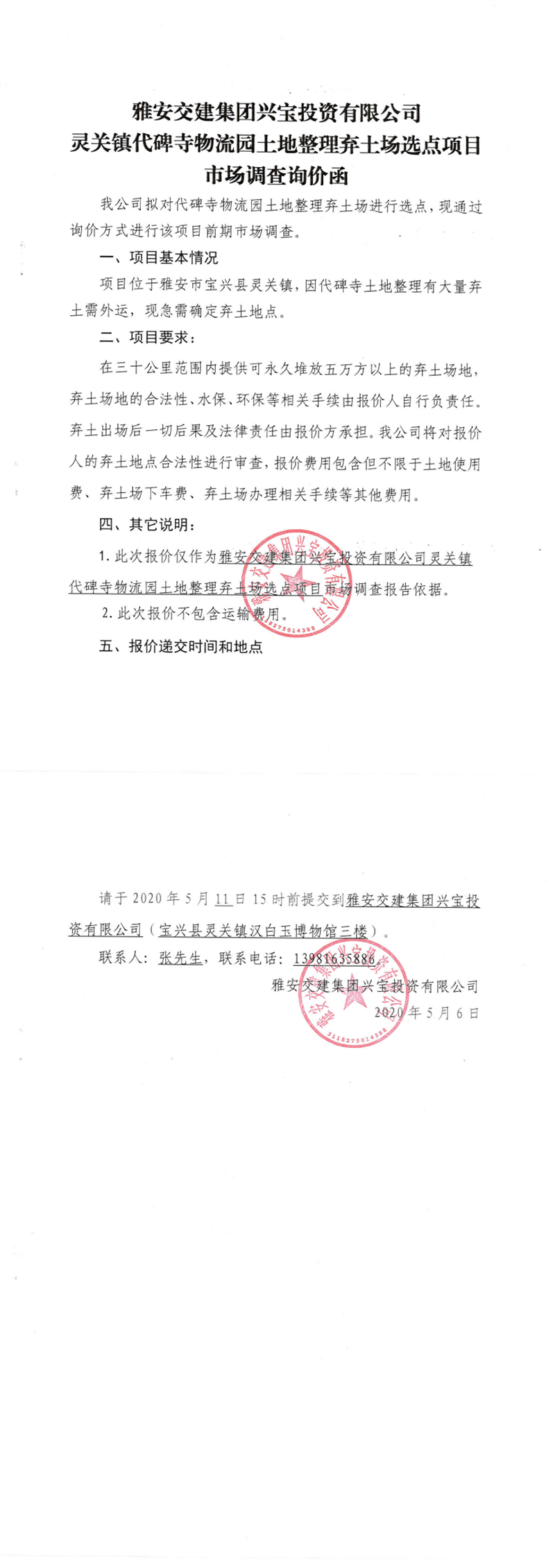 米兰体育-米兰(中国)官网 兴宝投资有限公司灵关镇代碑寺物流园土地整理弃土场选点项目市场调查询价函