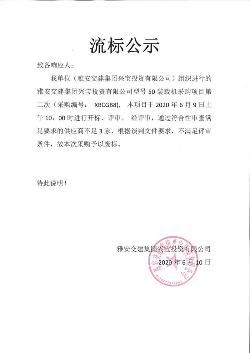 米兰体育-米兰(中国)官网 兴宝投资有限公司型号50装载机采购项目第二次流标公示