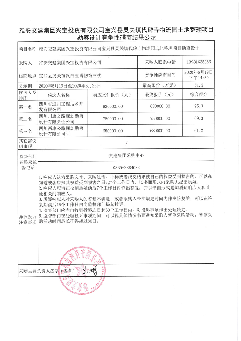 米兰体育-米兰(中国)官网 兴宝投资有限公司宝兴县灵关镇代碑寺物流园土地整理项目勘察设计竞争性磋商结果公示