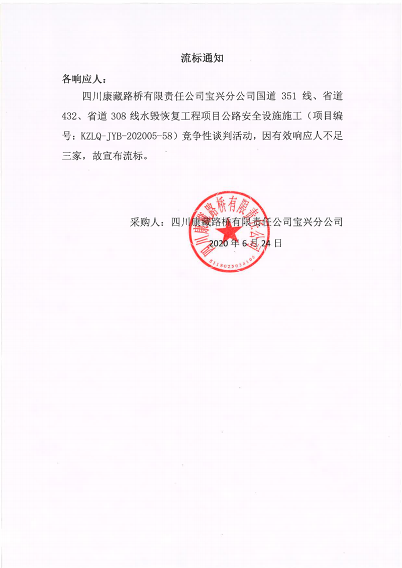 四川康藏路桥有限责任公司宝兴分公司国道351线、省道432线、省道308线水毁修复工程项目公路安全设施施工流标通知