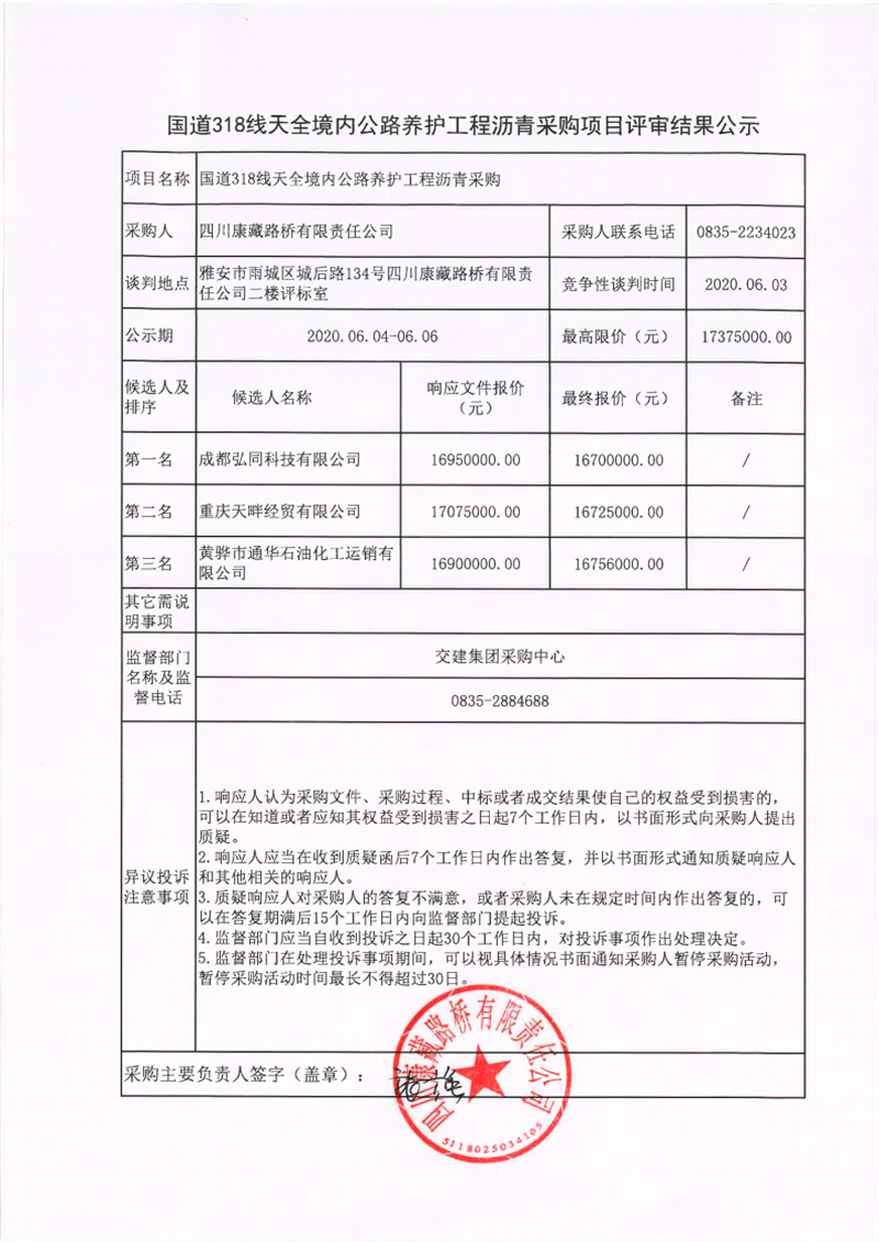 四川康藏路桥有限责任公司国道318线天全境内公路养护工程沥青采购项目评审结果公示