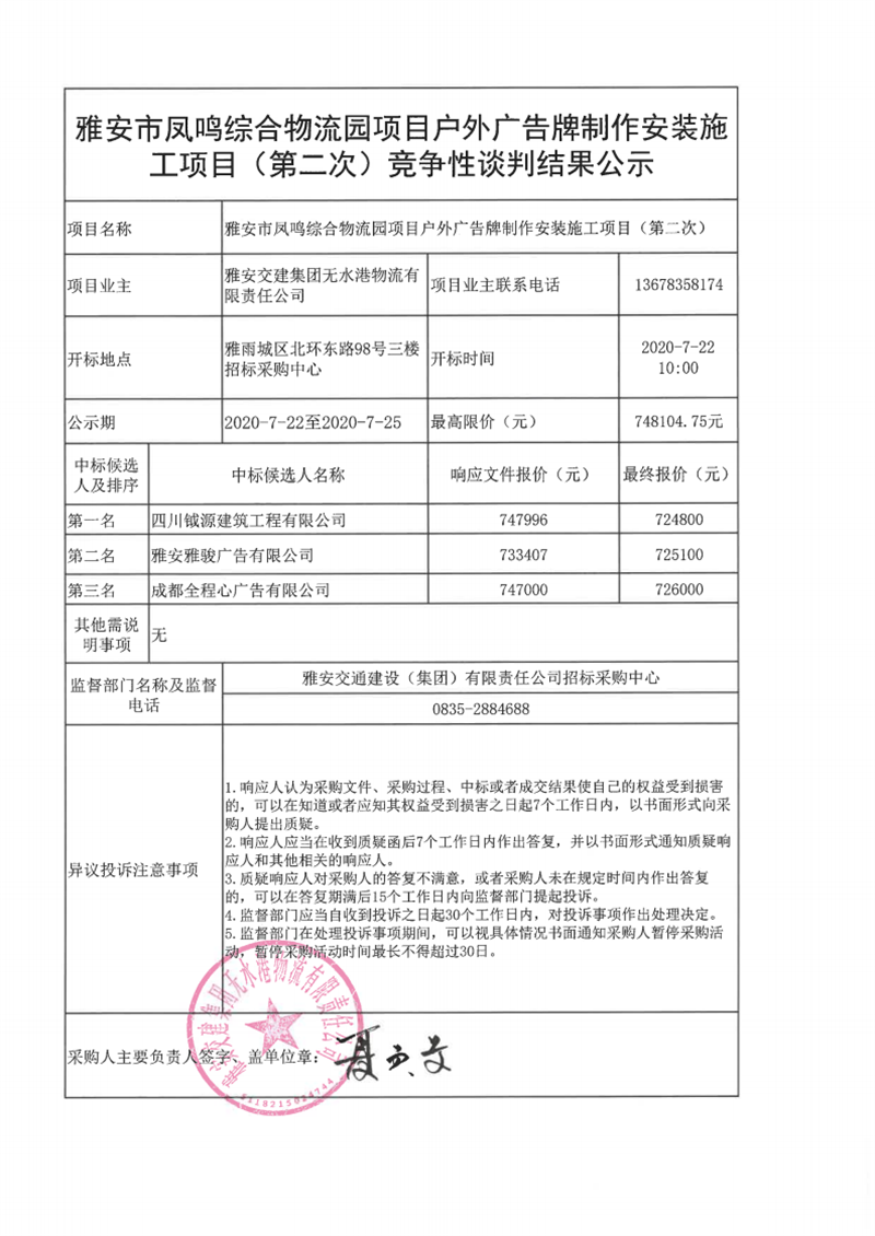 米兰体育-米兰(中国)官网 无水港物流有限责任公司雅安市凤鸣综合物流园项目户外广告牌制作安装施工项目(第二次)竞争性谈判结果公示
