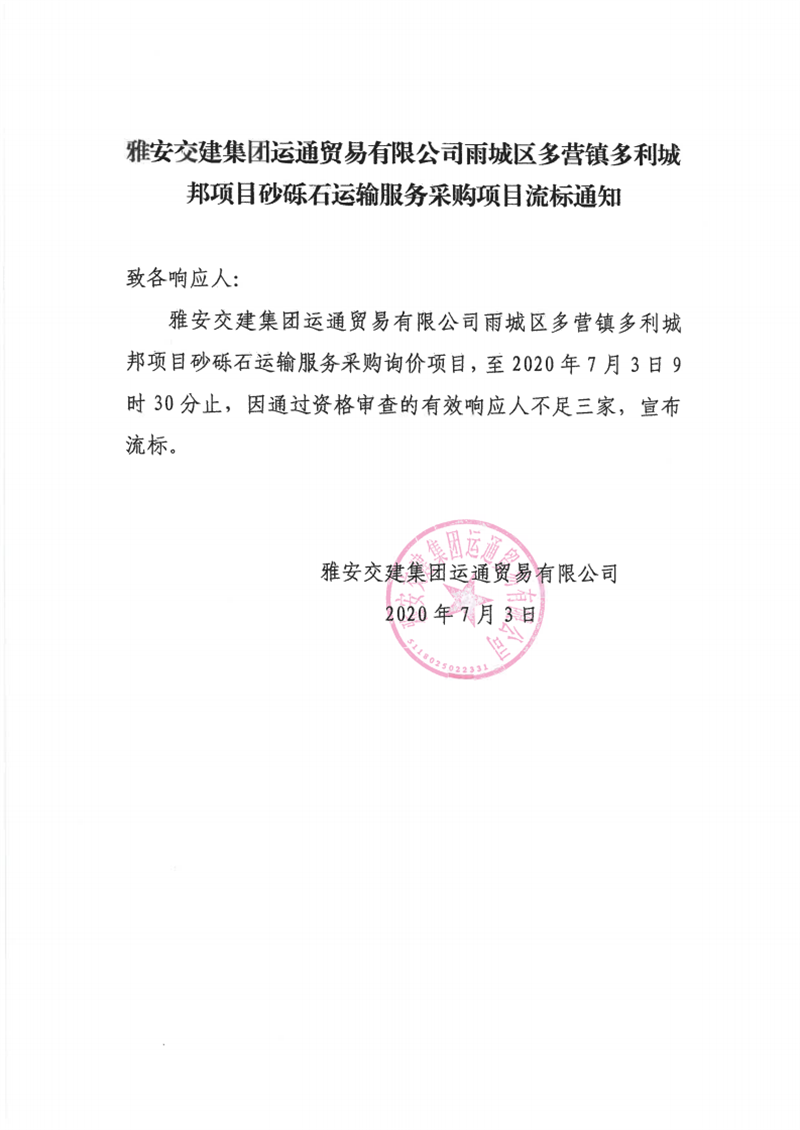 米兰体育-米兰(中国)官网 运通贸易有限公司雨城区多营镇多利城邦项目砂砾石运输服务采购项目流标通知