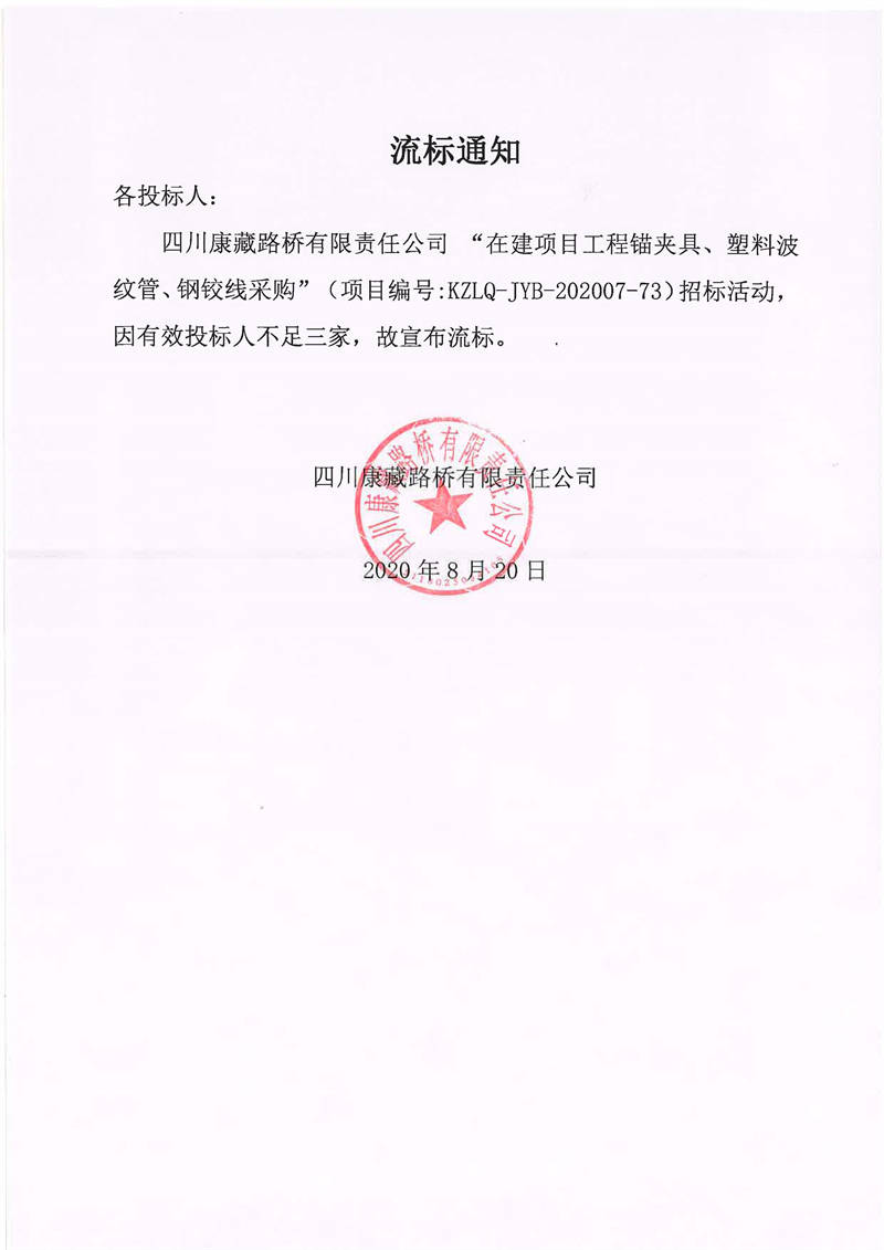 四川康藏路桥有限责任公司在建项目工程锚夹具、塑料波纹管、钢铰线采购流标通知