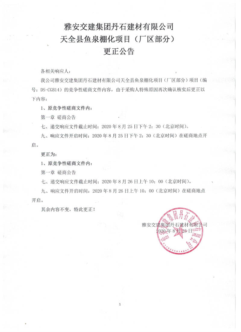 米兰体育-米兰(中国)官网 丹石建材有限公司天全县鱼泉棚化项目(厂区部分)更正公告