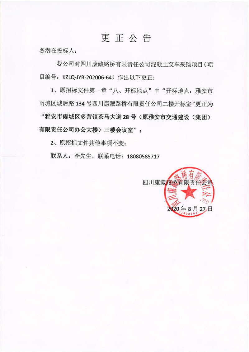 四川康藏路桥有限责任公司混凝土泵车采购项目更正公告