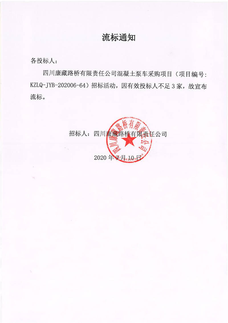 四川康藏路桥有限责任公司混凝土泵车采购项目流标通知