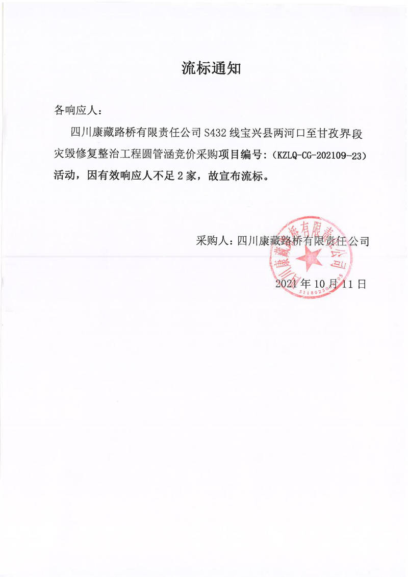 四川康藏路桥有限责任公司S432线宝兴县两河口至甘孜界段灾毁修复整治工程圆管涵采购竞价流标通知