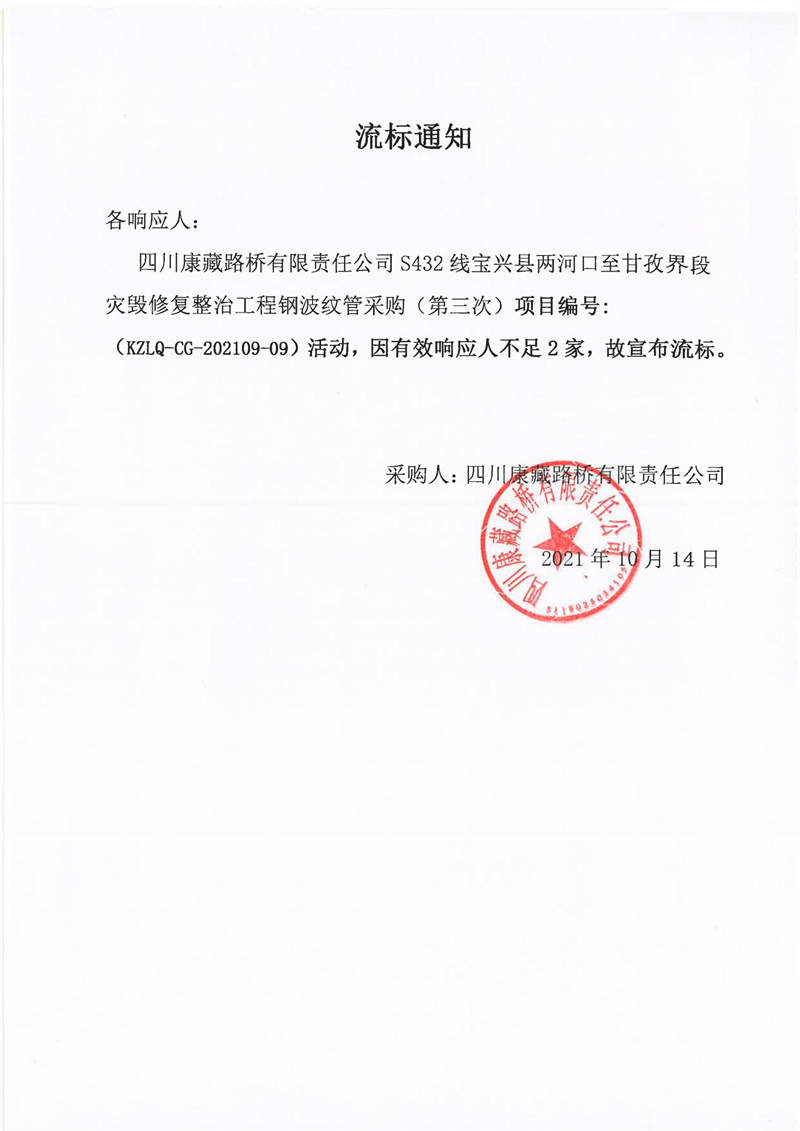 四川康藏路桥有限责任公司S432线宝兴县两河口至甘孜界段灾毁修复整治工程钢波纹管采购(第三次)竞价公告