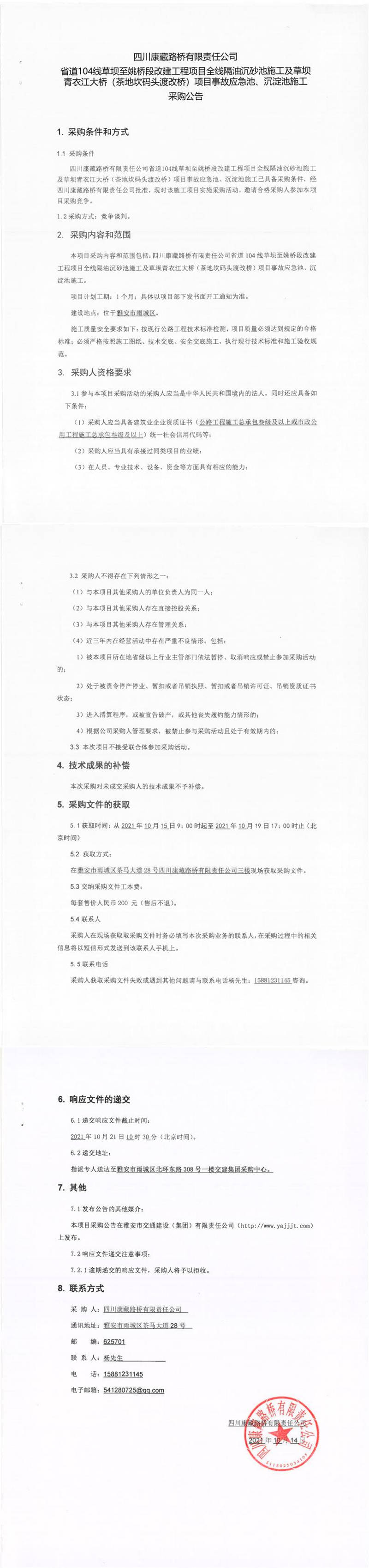 四川康藏路桥有限责任公司省道104线草坝至姚桥段改建项目全线隔油沉砂池施工及草坝青衣江大桥(茶地坎码头渡改桥)项目事故应急池、沉淀池施工采购公告