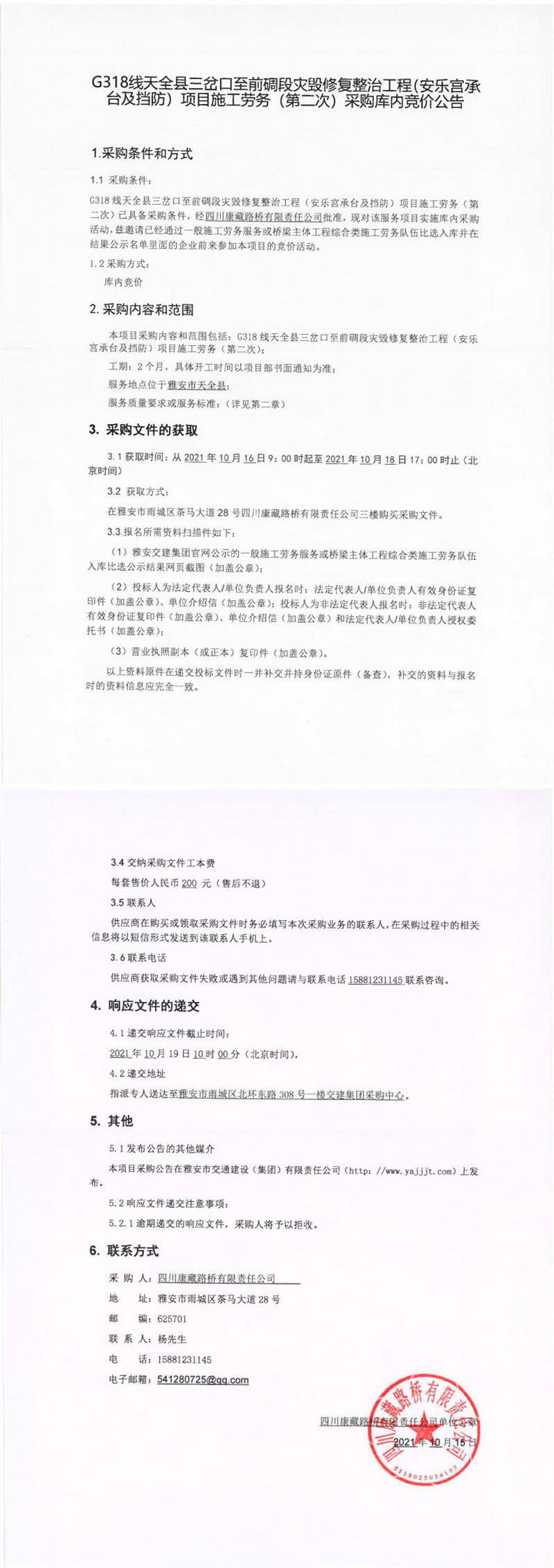四川康藏路桥有限责任公司G318线天全县三岔口至前碉段灾毁修复整治工程(安乐宫承台及挡防)项目施工劳务(第二次)采购库内竞价公告