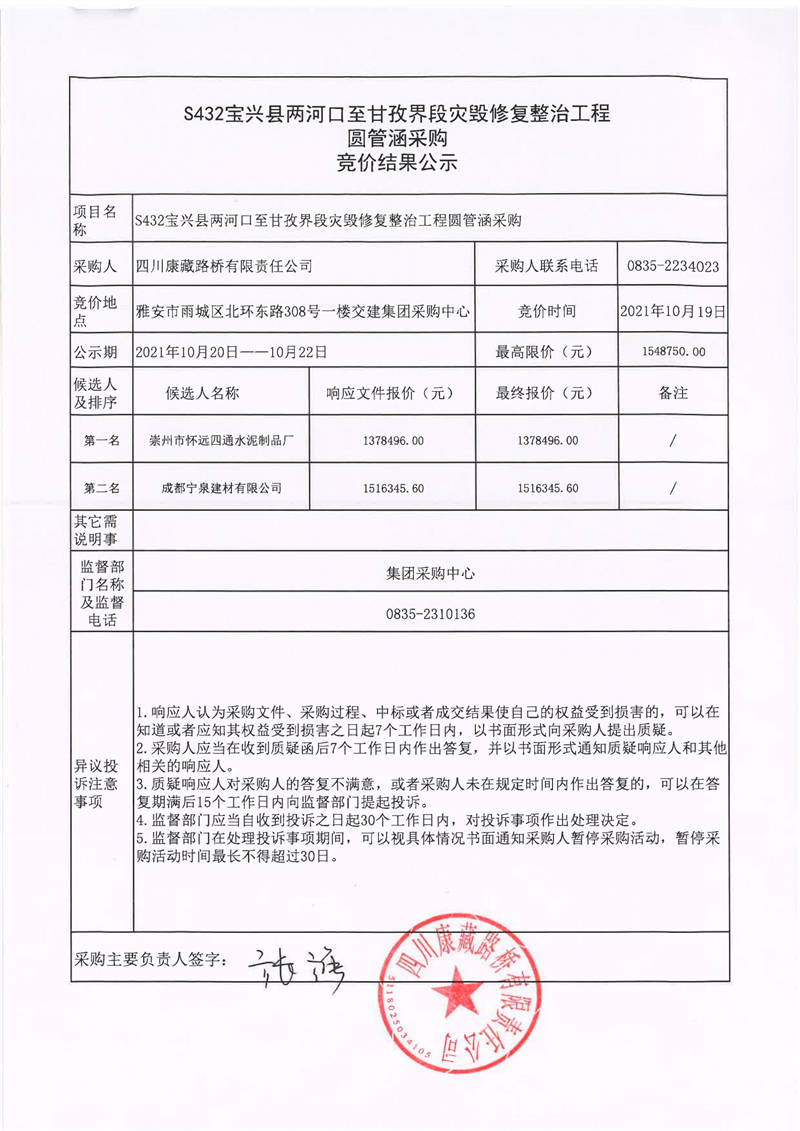 四川康藏路桥有限责任公司S432线宝兴县两河口至甘孜界段灾毁修复整治工程圆管涵采购竞价结果公示